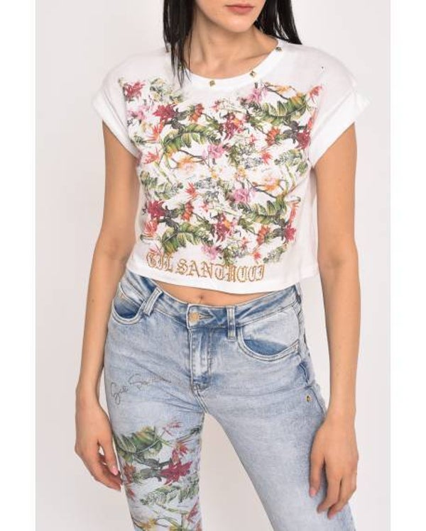 CROP T-SHIRT WITH FLOWERS FRONT PRINT